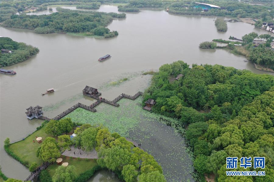 在沙家浜风景区,人们在革命教育区参观(5月18日无人机拍摄)。沙家浜风景区位于江苏省常熟市南隅,属于阳澄湖水系,周边水网密布。沙家浜风景区拥有独特的历史人文和自然生态资源,是国家5A级景区、国家湿地公园、全国百家红色旅游经典景区、全国爱国主义教育示范基地,每年吸引大量游客前来参观游览。新华社记者 季春鹏 摄