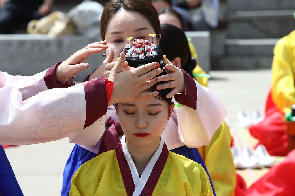 当地时间2019年5月20日,韩国首尔,年轻人穿着传统服装参加传统儒家成人仪式,该仪式是为今年已满20岁或将满20岁的年轻人举办的,旨在提高他们对成人责任的认识。