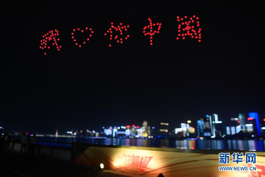 5月20日,杭州钱塘江畔上演“我爱你中国”主题灯光秀。 当晚,在浙江杭州钱塘江畔,城市灯光秀和约150架无人机组成的空中编队表演交相辉映。“520中国”“我爱你中国”“70年”……对祖国进行的一场“深情告白”闪耀钱塘两岸。
