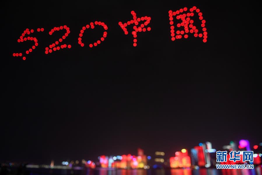 5月20日,杭州钱塘江畔上演“我爱你中国”主题灯光秀。 当晚,在浙江杭州钱塘江畔,城市灯光秀和约150架无人机组成的空中编队表演交相辉映。“520中国”“我爱你中国”“70年”……对祖国进行的一场“深情告白”闪耀钱塘两岸。