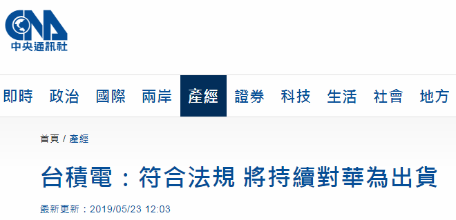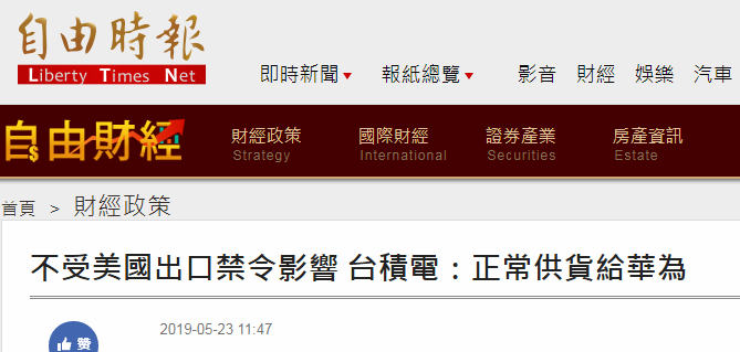 另外,台湾“中时电子报”5月23日报道台积电对华为持续出货一事时,用了这样的说法:无惧美国!台积电有种,力挺华为。