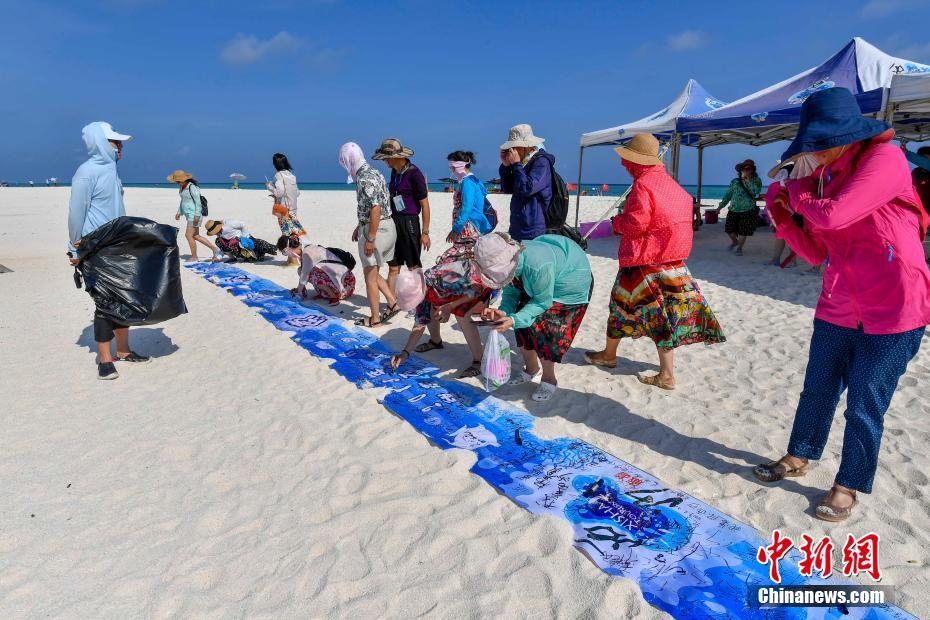 游客登上全富岛后在环保横幅上签名。骆云飞 摄