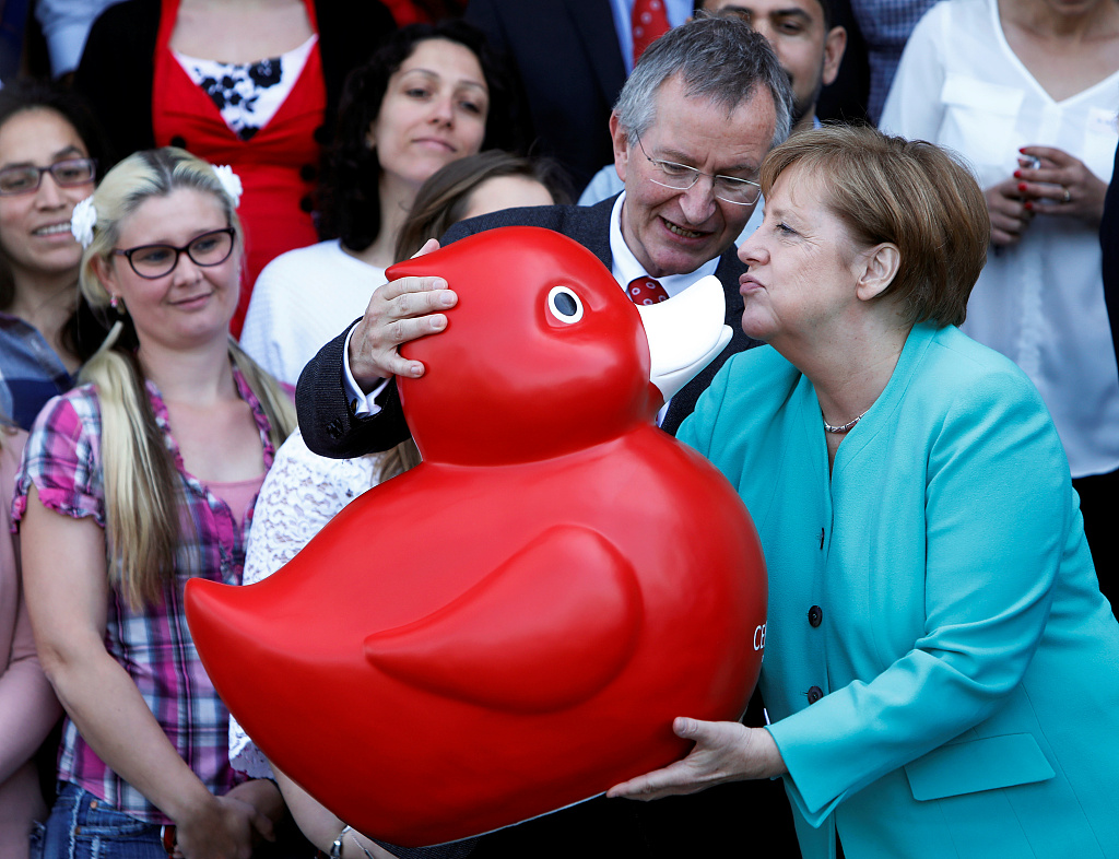 当地时间2019年5月23日,德国罗斯托克,德国总理默克尔参观生物技术公司 Centogene,获赠鸭子玩具。