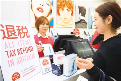 一名中国游客(右)在退税商店购买商品。 搜狗图片
