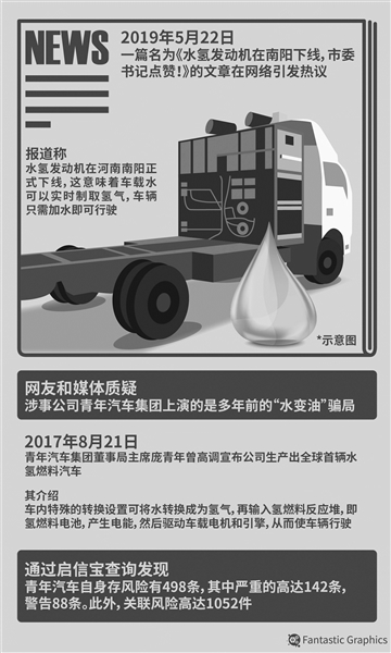 5月23日,《南阳日报》在头版刊发文章称,水氢发动机在南阳市正式下线,车载水可以实时制取氢气,车辆只需加水即可行驶。据文章中介绍,这一项目是青年汽车集团和南阳的合作项目,涉事公司曾获得过当地补贴。昨日(24日),北京青年报记者向当地多个部门求证,得到的说法不一。高新区、交通局相关工作人员均表示以市委宣传部口径为准。截至记者发稿时,市委宣传部电话始终未有人接听。北青报记者搜索看到,该公司曾因债务纠纷多次被起诉,但因有履行能力而拒不履行偿还义务,4年内30次被纳入信用黑名单。