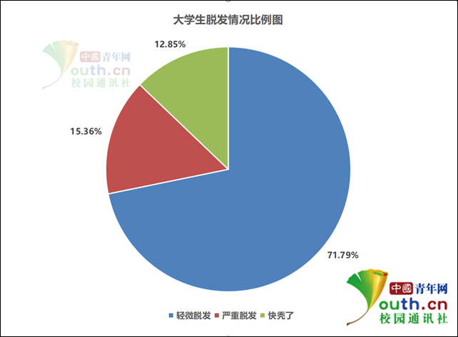 对于进入脱发状态的学生来说,程度如何?据中国青年网记者调查,71.79%的大学生处于轻微脱发状态,15.36%处于严重脱发,12.85%表示自己都快秃了。