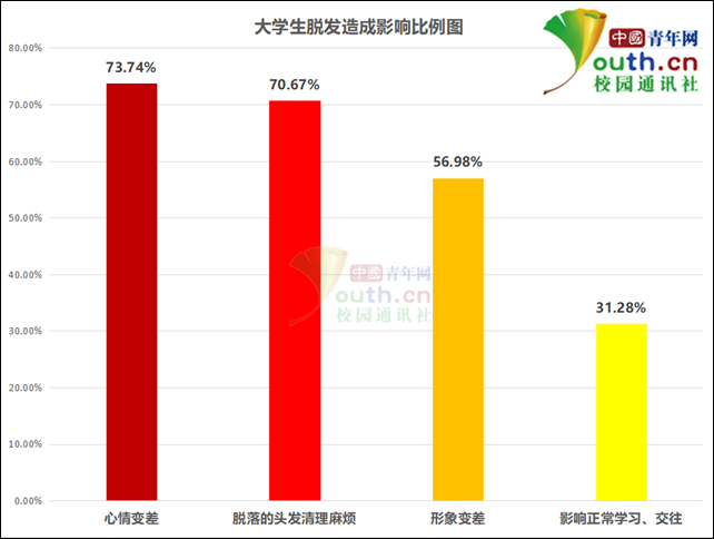 那么,脱发对大学生的学习生活造成哪些影响?调查显示:73.74%的大学生表示脱发会造成心情变差,70.67%表示脱落的头发清理起来麻烦,56.98%认为脱发造成现象变差,31.28%认为脱发影响了正常的学习、交往。