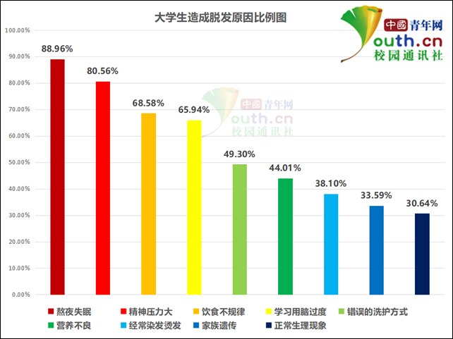 造成脱发的原因有哪些?调查显示:88.96%的大学生认为“熬夜失眠”会造成脱发,80.56%选择“精神压力大”,68.58%选择“饮食不规律”,65.94%选择“错误的洗护方式”,44.01%选择“营养不良”,38.1%选择“经常染发烫发”,33.59%选择“家族遗传”,30.64%则认为是“正常的生理现象”。
