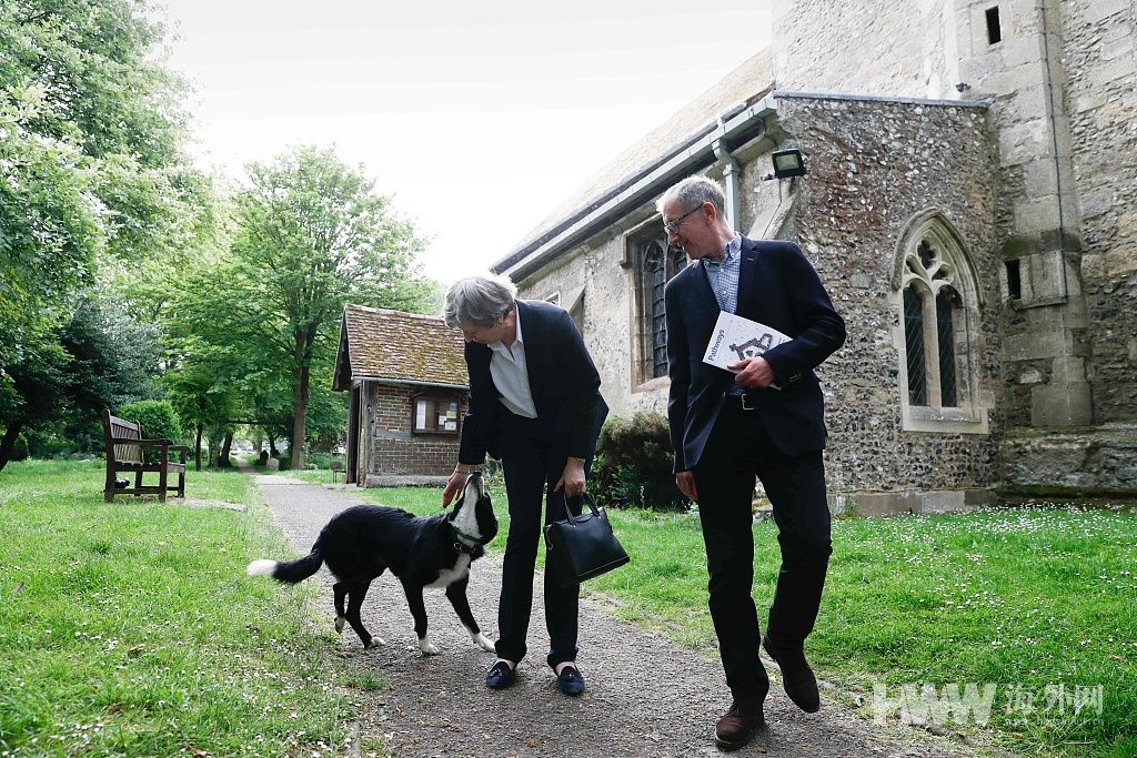 特雷莎·梅和丈夫周末做礼拜 弯腰逗狗心情不错