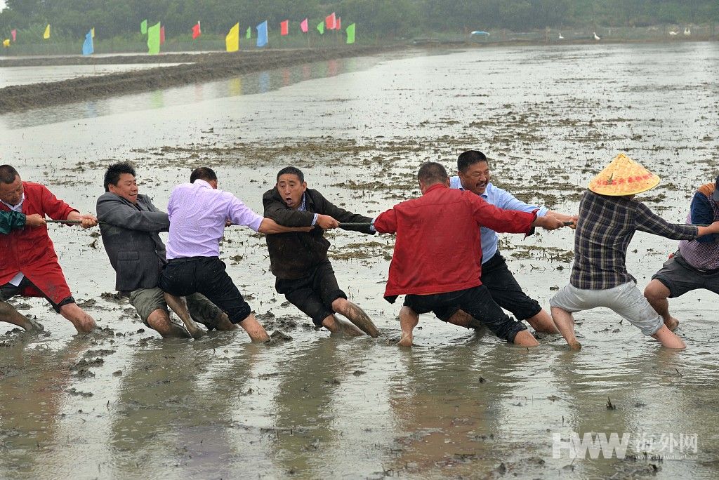 图为游客在稻田利拔河,体验农耕乐趣,感受田园生活。(图:视觉中国)