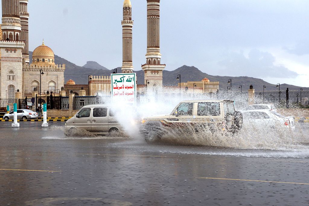 也门暴雨引发洪灾 街道被淹民众淌水出行