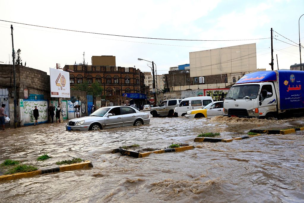 当地时间2019年5月26日,也门萨那,暴雨过后,街道被洪水淹没。