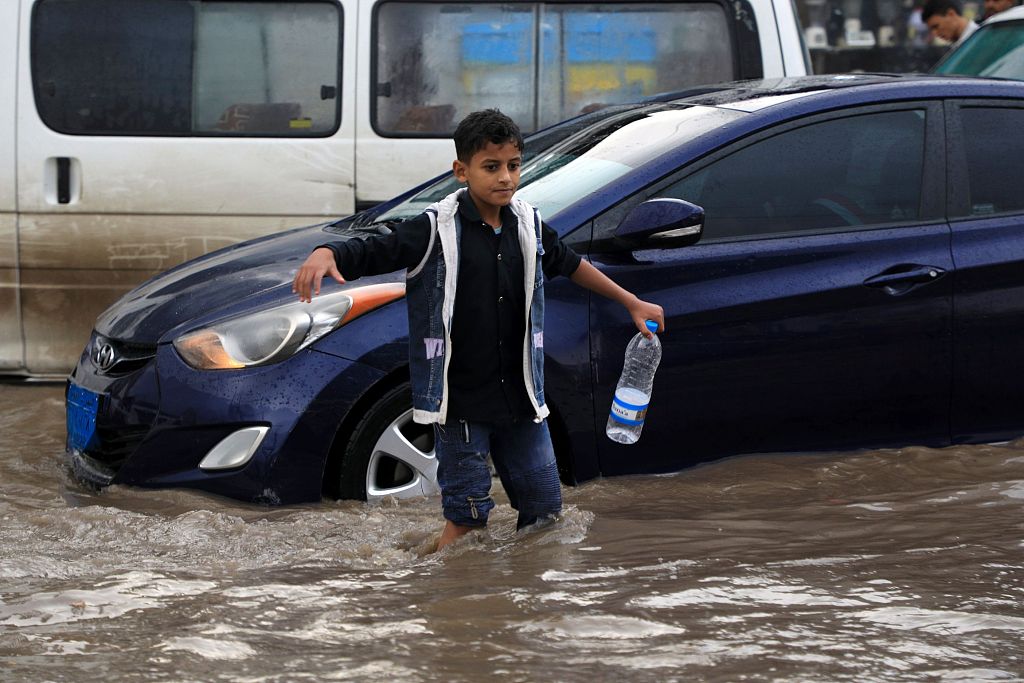 当地时间2019年5月26日,也门萨那,暴雨过后,街道被洪水淹没。