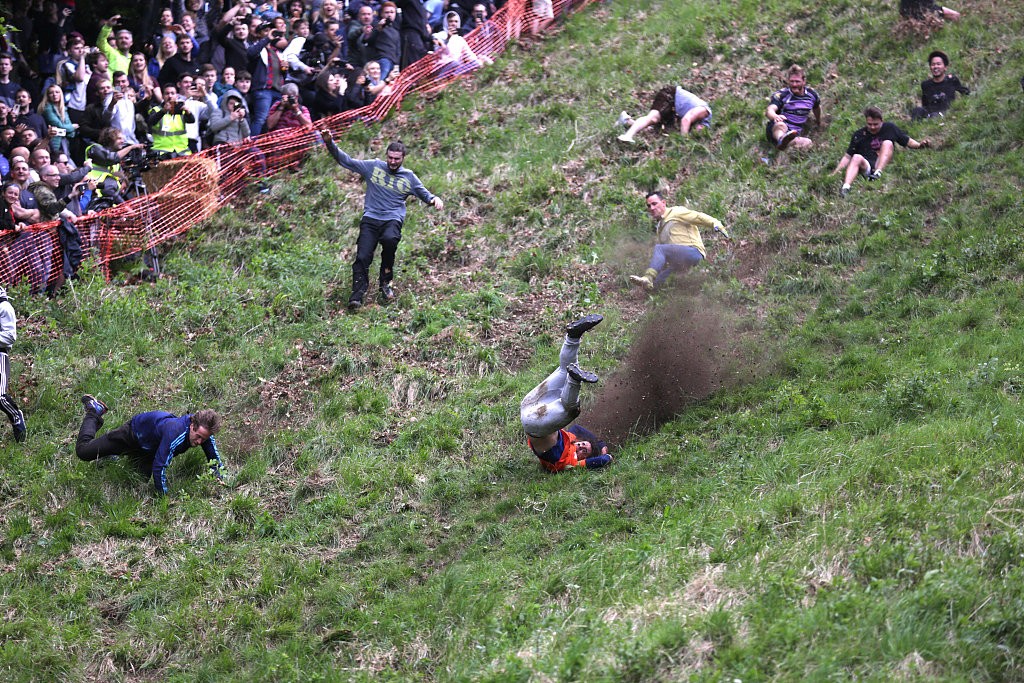 英国举办年度“滚奶酪”大赛 参赛者滚山坡“人仰马翻”场面惊险刺激
