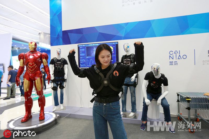 2019年5月27日,尖叫科技展示的“机械外骨骼”,通过人体仿生学等技术,助力快递员搬运重物,让快递员瞬间变身钢铁侠,轻松搬运。(图:东方IC)