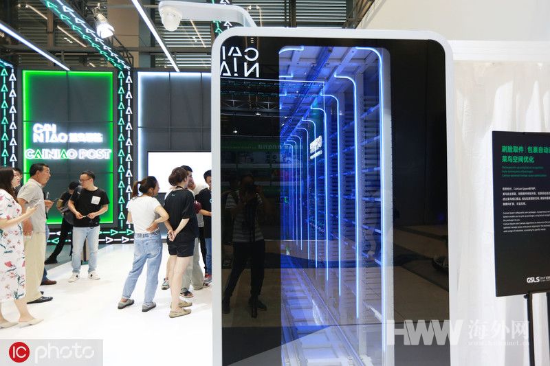 2019年5月27日,探营2019全球智慧物流峰会展区“黑科技”,快递飞艇、无人直升机、5G自动驾驶等顶尖物流黑科技集体亮相杭州,感受未来快递生活。5月28日,2019全球智慧物流峰会将在杭州国际博览中心举行。图为刷脸取件,包裹自动送达。(图:东方IC)