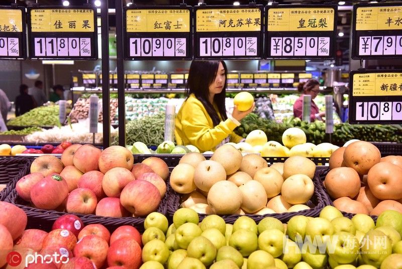 2019年5月9日,顾客在河北石家庄新乐市一家超市选购水果。(图:东方IC)