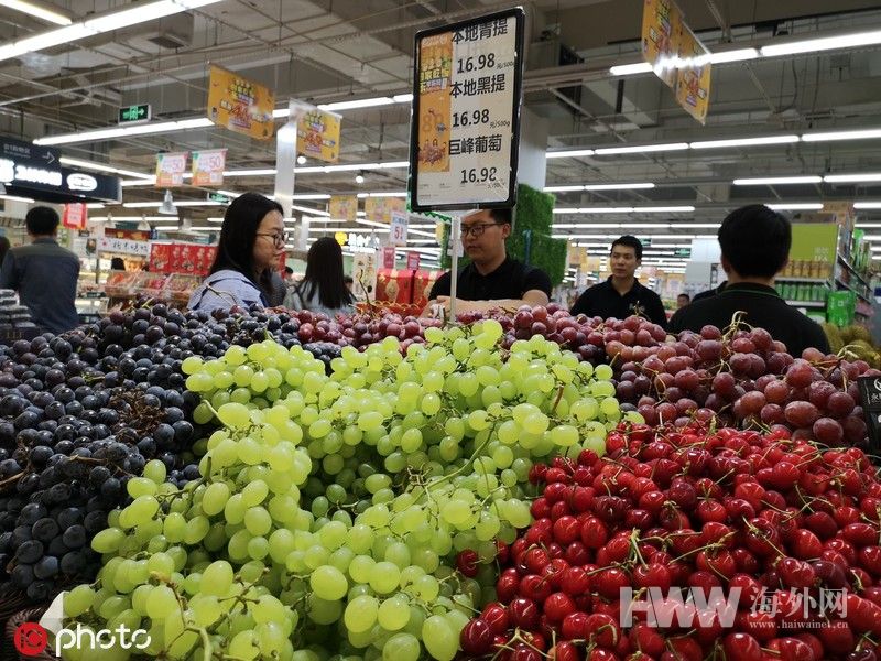 2019年5月19日,浙江宁波一超市里的水果售价.本地青提16.98元,巨峰葡萄每斤16.98元。(图:东方IC)