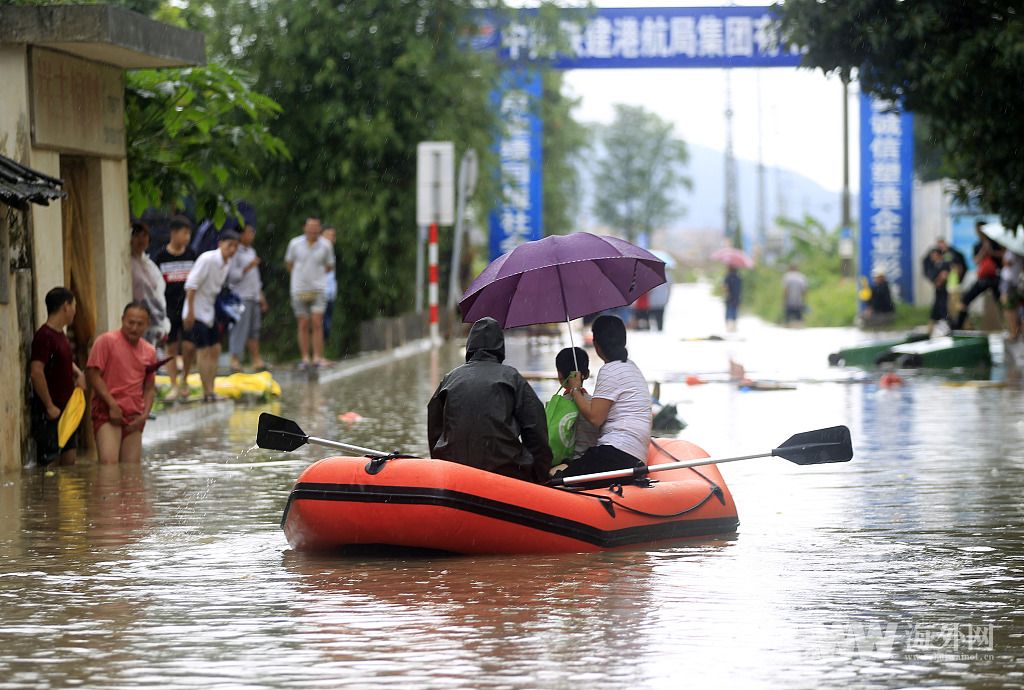 2019年5月27日,广东珠海,红旗镇藤山社区工作人员在转移群众。据悉,从26日上午9时至27日9时,金湾区普降大雨到大暴雨,主要降雨集中在红旗镇,累计录得最大降雨量超过500毫米。对此,该区三防指挥部于27日0时50分启动三级应急响应,2时50分启动二级应急响应,3时30分启动一级响应。(图:视觉中国)