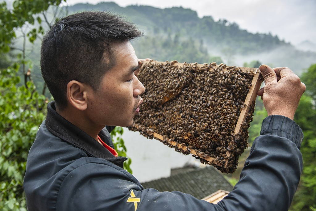 2019年4月21日,代贵正在察看自己养的蜜蜂。因为要照顾菊梅和孩子,再加上头部受伤初愈,远的地方不能去,代贵只能在家里做一些力所能及的事,打理农田、做家务、带孩子、协助菊梅做电商......