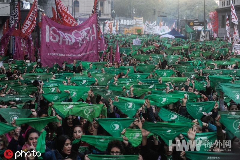 ​当地时间2019年5月28日,阿根廷布宜诺斯艾利斯,合法堕胎支持者在会场外举绿丝巾集会示威。(图:东方IC)
