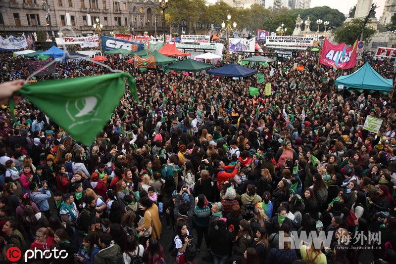 当地时间2019年5月28日,阿根廷布宜诺斯艾利斯,来自阿根廷“争取合法、安全和自由堕胎权利运动”(National Campaign for the Right to Legal, Safe and Free Abortion)的代表们将一项堕胎合法化新议案提交至国会,这一天也正好是国际妇女健康行动日,合法堕胎支持者在会场外举绿丝巾集会示威。(图:东方IC)