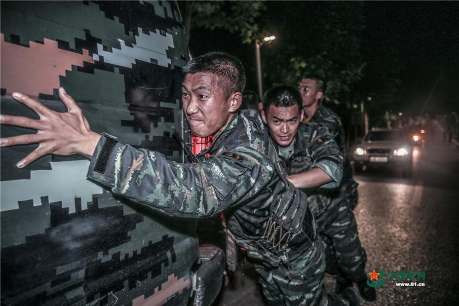 一群平均年龄22岁的特战队员,人均负重30公斤作战装备,一周徒步行军200公里,每天训练不少于18小时,其中夜间训练不少于6小时。图为特战队员进行8公里车辆推行训练。胡港 摄 图片来源:中国军网