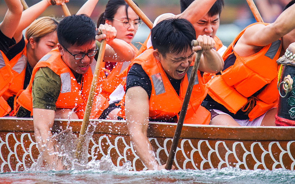 2019年5月30日,广州,广东外语外贸大学南国商学院全校师生喜迎端午,于校内越龙湖举行“赛龙舟”端午传统习俗活动。