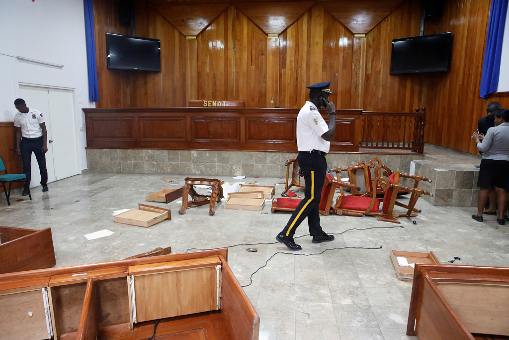 当地时间2019年5月30日,海地太子港,参议院会议大厅遭反对派参议员打砸,地板上散落着被损坏的桌椅。