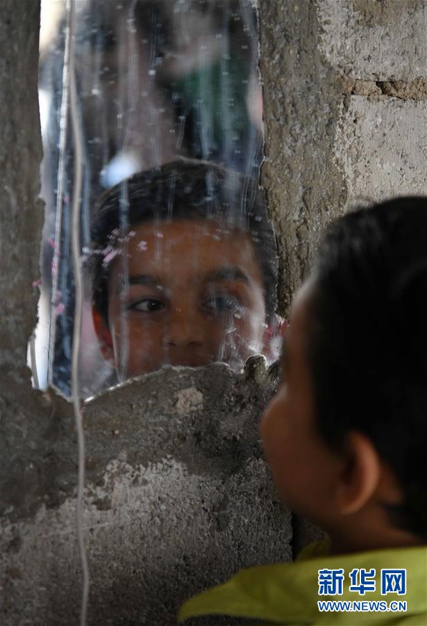 5月28日,在叙利亚首都大马士革杰拉马纳区,易卜拉欣在屋内照镜子。新华社发(萨法尔贾拉尼)