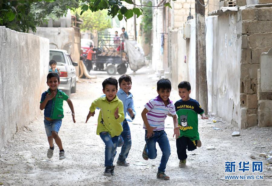 5月28日,在叙利亚首都大马士革杰拉马纳区,易卜拉欣(左二)和玩伴在住所外玩耍。新华社发(萨法尔贾拉尼)