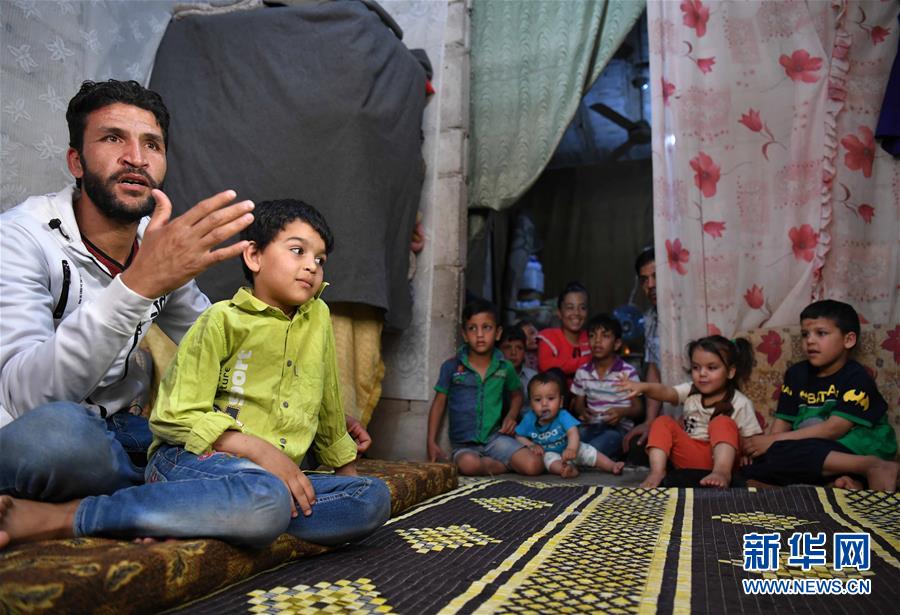 5月28日,在叙利亚首都大马士革杰拉马纳区,易卜拉欣(左二)和父亲侯赛因·穆萨在屋内接受记者采访。 新华社发(萨法尔贾拉尼)