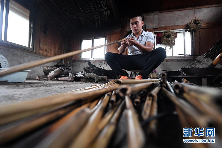 5月30日,在融水苗族自治县安太乡小桑村青山屯,杜信文在挑选熏干的竹子准备做芦笙。 新华社记者 陆波岸 摄
