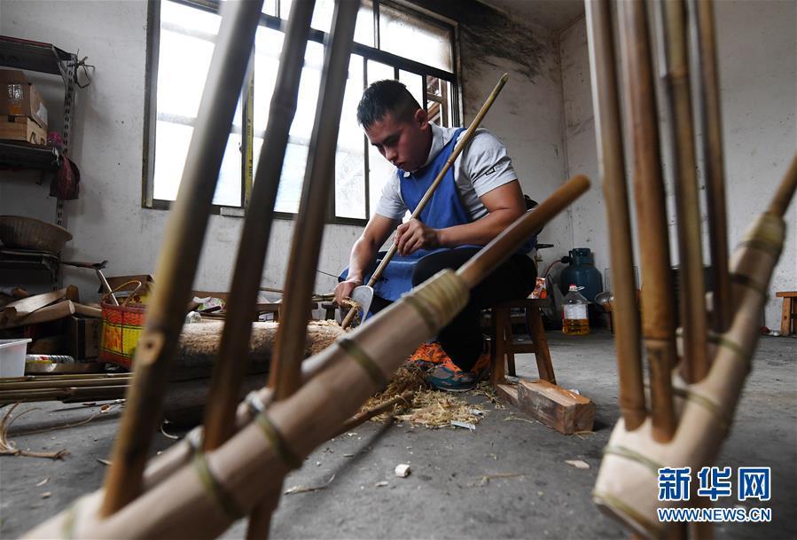 5月30日,在融水苗族自治县安太乡小桑村青山屯,杜信文在制作芦笙。 新华社记者 陆波岸 摄