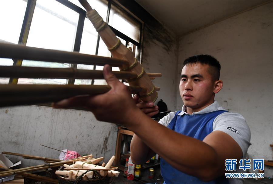 5月30日,在融水苗族自治县安太乡小桑村青山屯,杜信文在制作芦笙。 新华社记者 陆波岸 摄