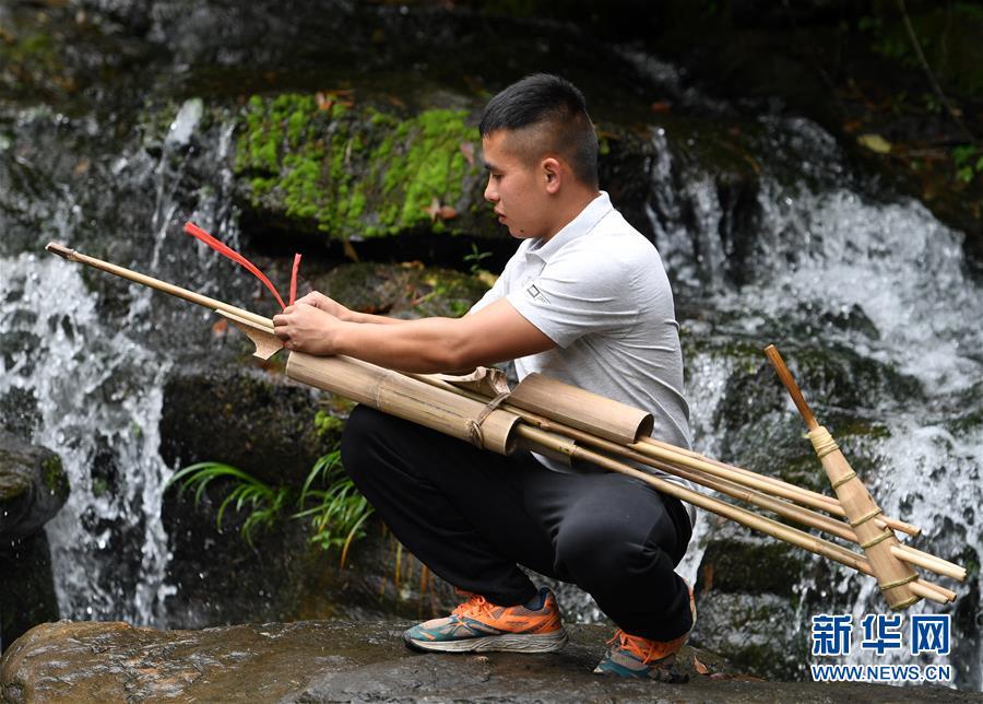 5月30日,在融水苗族自治县安太乡小桑村青山屯,杜信文在家门外调试一把刚刚制作完成的芦笙。 新华社记者 陆波岸 摄