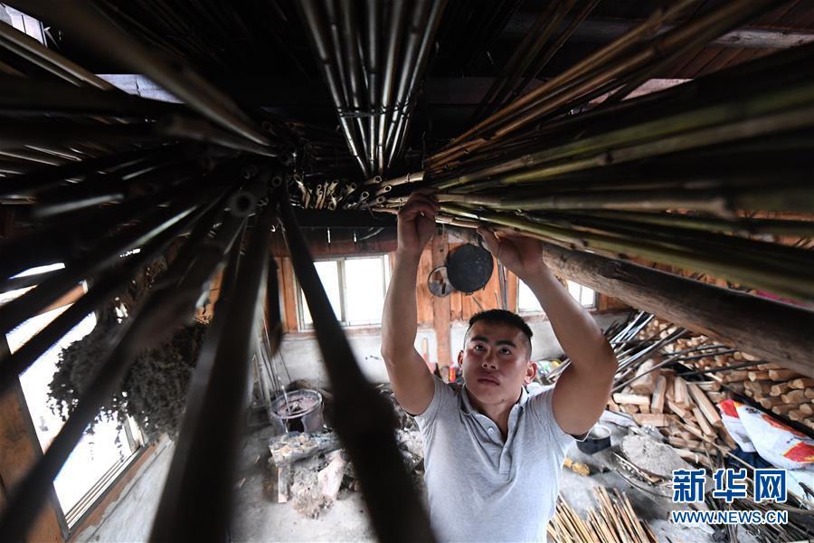 5月30日,在融水苗族自治县安太乡小桑村青山屯,杜信文在挑选熏干的竹子准备做芦笙。1994年出生的杜信文是广西融水苗族自治县安太乡小桑村青山屯人,因父亲是当地芦笙制作的能工巧匠,他从小就受到芦笙制作艺术的熏陶。2017年,杜信文从一所大专院校毕业后,放弃外出找工作的念头,决定在家向父亲学习制作芦笙,想把这项民族技艺传承下来。经过一年多时间的潜心学习,目前杜信文已经可以独立制作芦笙。他说,芦笙是苗族文化的重要象征,但当地会制作芦笙的长辈年纪越来越大,自己作为苗族后代,有义务把技艺传承下去。目前,除继续深入钻研芦笙制作技艺外,杜信文还准备通过互联网把芦笙产品和芦笙文化向外界宣传推广,在传承民族文化的同时,努力把芦笙做成一个产业,让更多的人能够以此过上好日子。新华社记者 陆波岸 摄