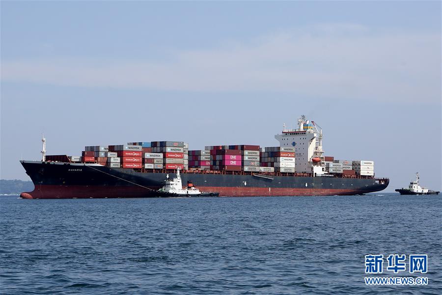 5月30日,一艘加拿大政府派遣的货船停泊在菲律宾北部苏比克湾自由港,准备将6年前堆放在菲律宾的69箱垃圾运离。新华社发(乌马利 摄)