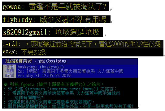 连日来,岛内网络上网友对“雷霆-2000”的真实水平已有不少吐槽:“早就被淘汰了”“威力少又射不准”“一点用都没有”。