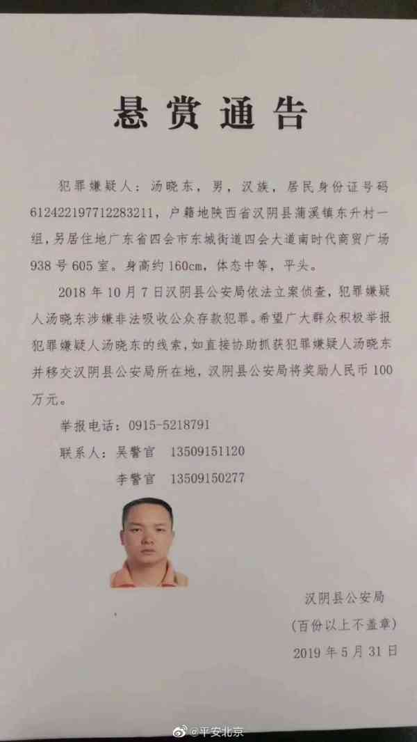 悬赏通告显示,犯罪嫌疑人汤晓东涉嫌非法吸收公众存款犯罪,2018年10月7日汉阴县公安局依法立案侦查。警方希望广大群众积极举报犯罪嫌疑人汤晓东的线索,如直接协助抓获犯罪嫌疑人汤晓东并移交汉阴县公安局所在地,汉阴县公安局将奖励人民币100万元。