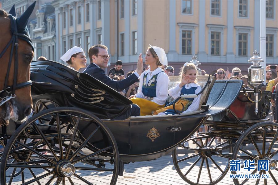 6月6日,在瑞典斯德哥尔摩,瑞典女王储维多利亚(左一)、丈夫丹尼尔王子(左二)前往市中心的斯堪森公园,与民众共同庆祝瑞典国庆日。 6月6日是瑞典国庆日。 新华社发(魏学超摄)