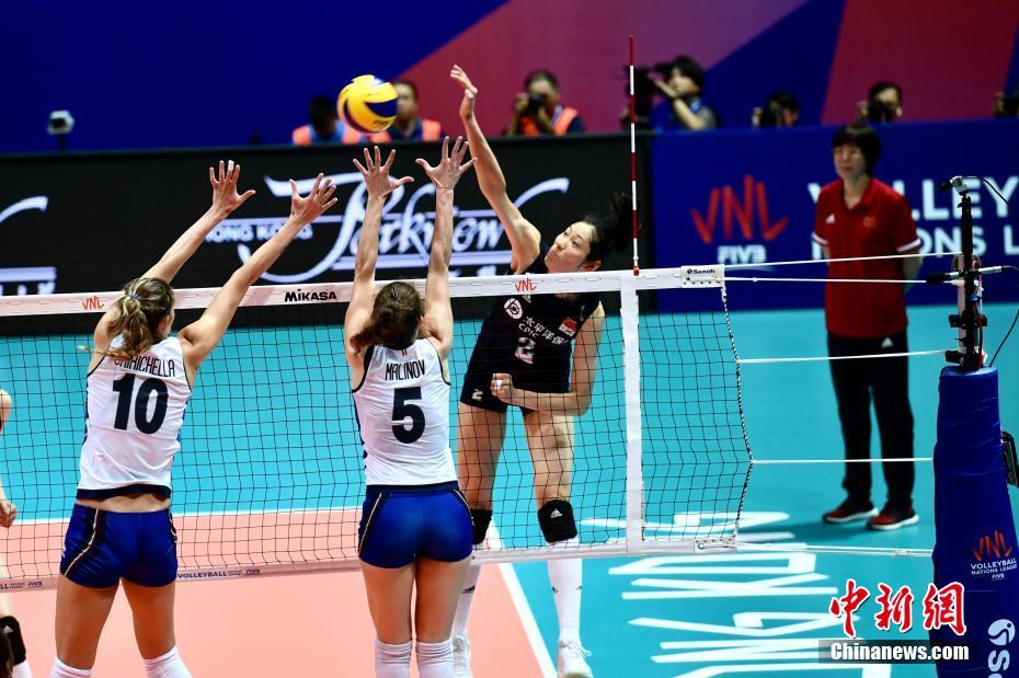 6月6日,香港排球总会主办的“FIVB世界女排联赛香港2019”于香港体育馆举行最后一天的赛事。中国队比赛开始初段打得并不顺利,在落后意大利两局的情况下,慢慢掌握比赛节奏,以3-2局数反胜意大利,艰难地取得胜利。3天赛事中,中国队以全胜的成绩完成香港站的赛事。中新社记者 李志华 摄