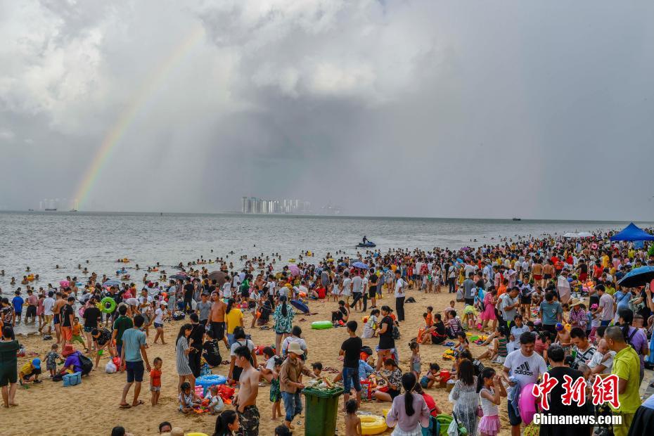 据官方统计,截至当日19时,共计有近10万人次的民众在假日海滩景区附近海边“洗龙水”,海边人头攒动如“下饺子”,场面十分壮观。中新社记者 骆云飞 摄