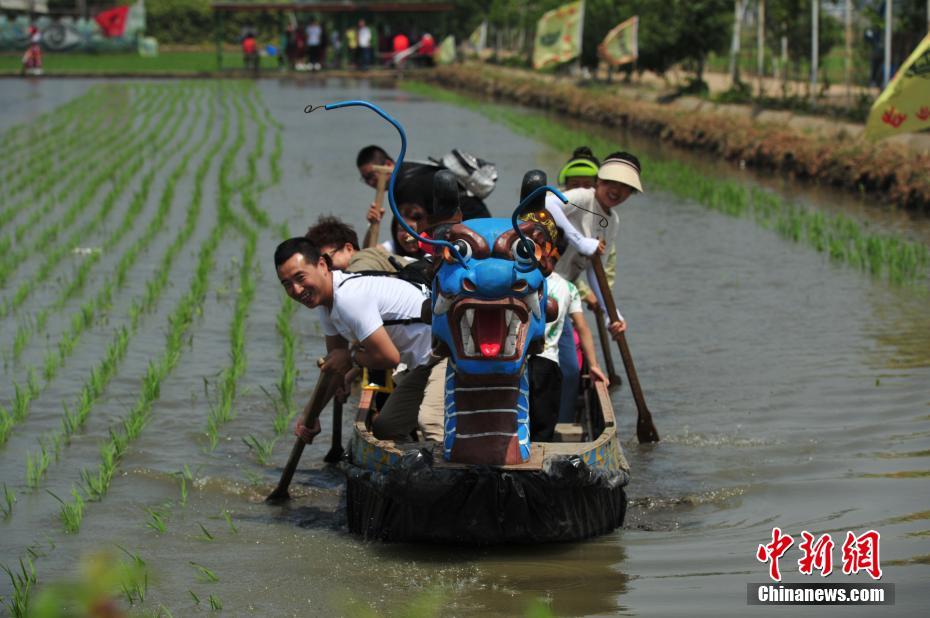 6月7日,市民体验泥地里划龙舟。端午节当天,沈阳市“稻梦空间”里举行了一场别开生面的泥地龙舟比赛。中新社记者 于海洋 摄