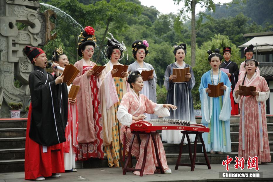 6月7日,端午节,四川乐山一群汉服爱好者齐聚嘉定坊,举行“弘扬传统 浓情端午”民俗文化体验活动。图为汉服爱好者吟唱。中新社记者 刘忠俊 摄