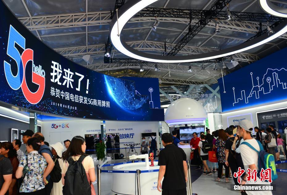 6月7日,游客在北京世园会中国电信5G体验区内参观。中新社记者 张兴龙 摄