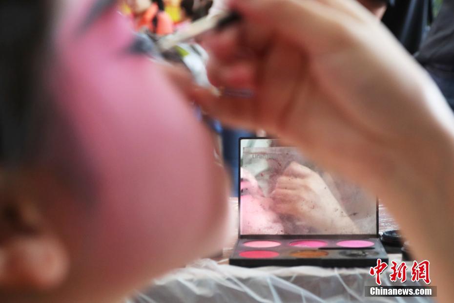 6月7日,端午假期,京剧淮剧《白蛇传》在上海京剧院内同台合演,令上海票友大饱耳福。除大戏之外,演员和舞美还为幸运人士画脸谱、穿戏服,一起体验京剧后台的舞美艺术。中新社记者 张亨伟 摄
