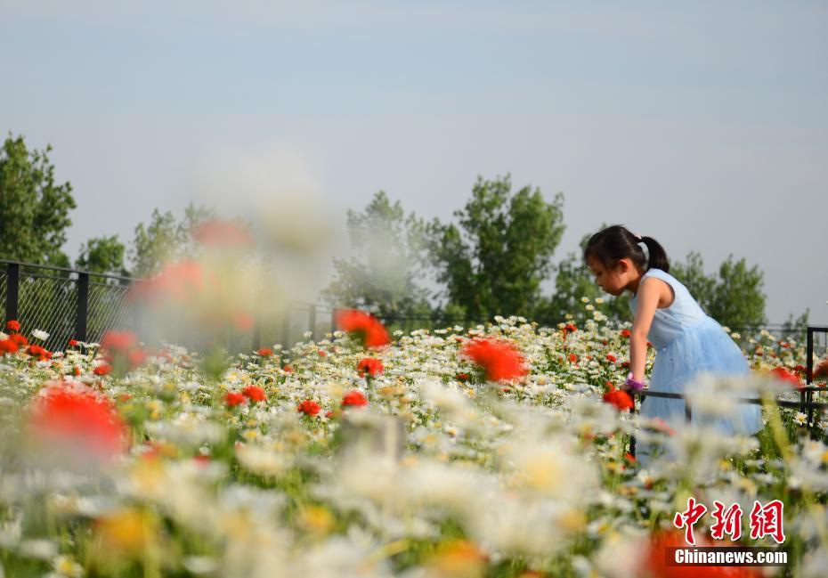 6月7日,一名小女孩在北京世园会植物馆屋顶花园赏花。当日是端午小长假首日,北京世园会吸引众多游客前来参观游览。中新社记者 张兴龙 摄