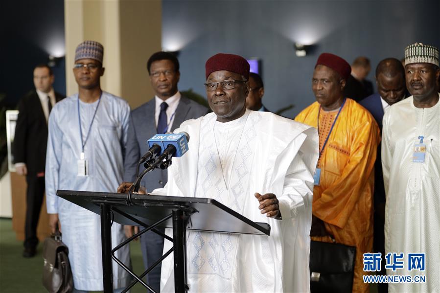 6月7日,在位于纽约的联合国总部,尼日尔外长卡拉(中)在尼日尔当选2020年和2021年安理会非常任理事国后会见媒体。新华社记者 李木子 摄