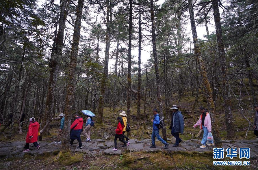 6月8日,游客在丽江老君山国家公园九十九龙潭景区内游览。 老君山国家公园位于云南省丽江市西部,是世界自然遗产“三江并流”的八大片区之一,壮美的景色吸引了大批游客前来观奇揽胜。 新华社记者秦晴摄